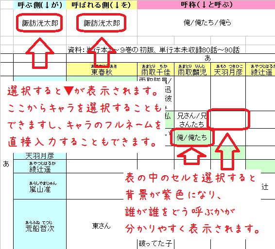 4.Excelの呼称表を開くと、呼ぶ側(B2)や呼ばれる側(C2)をタップして表示される▼からキャラを選択し、呼称(D2)で呼び方を確認をすることができます。