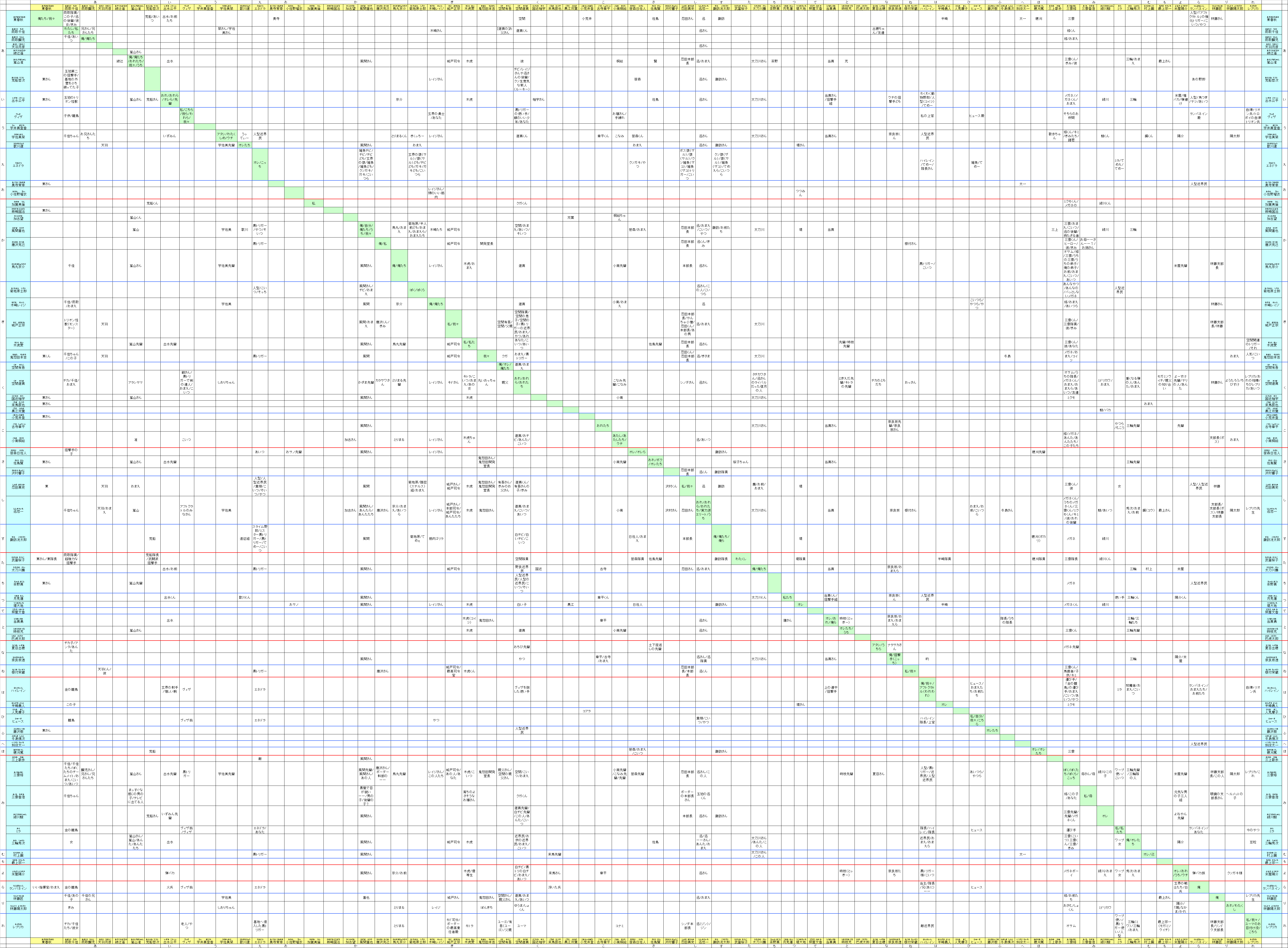 ・学年は作中2014年2月19日(水)を基準として誕生日から出したものです。単行本に記載されている年齢が作中当時の年齢なのか、既に誕生日を迎えた年齢なのか判断がつかないため、特に早生まれのキャラの学年が間違っている可能性があります。また、誕生日が分からない学生キャラは学年を空欄にしました。・年齢と学年の再計算機能をExcelにつけました。各シート「G1」の年月日を変更すると、未来や過去の日付でキャラが何歳で何年生かが分かります。
