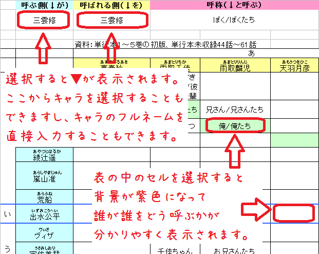 ・表や選択欄は、フルネームであいうえお順に登場人物名が並んでいます。